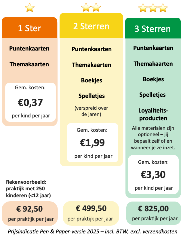 Onze pakketten zijn er in drie varianten: ⭐ 1 ster, ⭐⭐ 2 sterren en ⭐⭐⭐ 3 sterren. Elk pakket is compleet en zelfstandig inzetbaar en hoe meer sterren, hoe rijker gevuld het pakket.